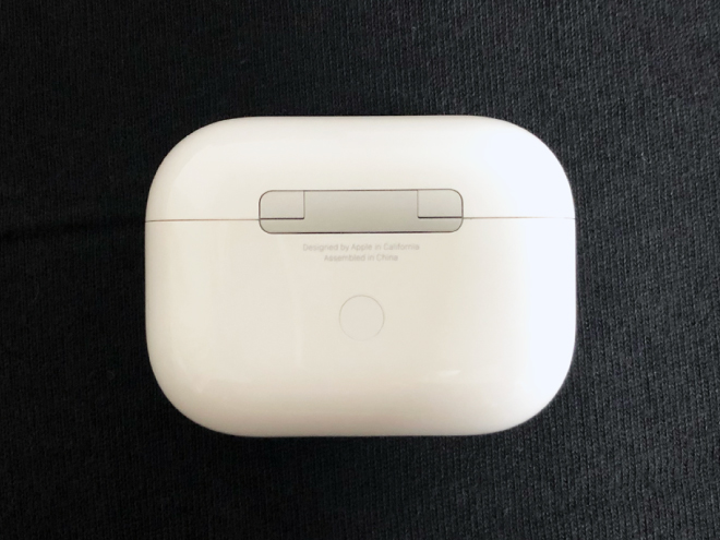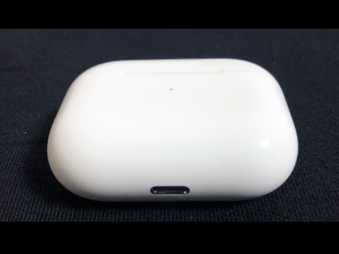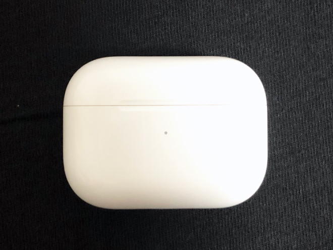 「AirPods Pro」収納ケース表側。全体的に丸みを帯びたケースです。